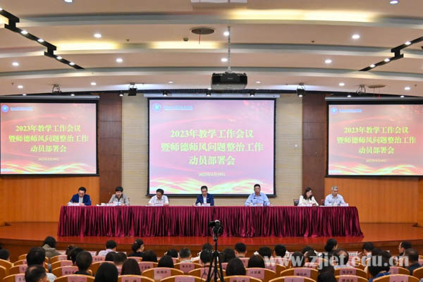 4月19日下午,学校召开2023年教学工作会议暨学校师德师风问题整治工作动员部署会。学校领导班子成员,全体中层干部、教务处、教师工作部、质量监管办公室、职业教育研究所、产学研合作中心、国际交流与合作中心的全体工作人员,各二级学院教师等参加会议。会议由党委委员、副校长蒋丽君主持。